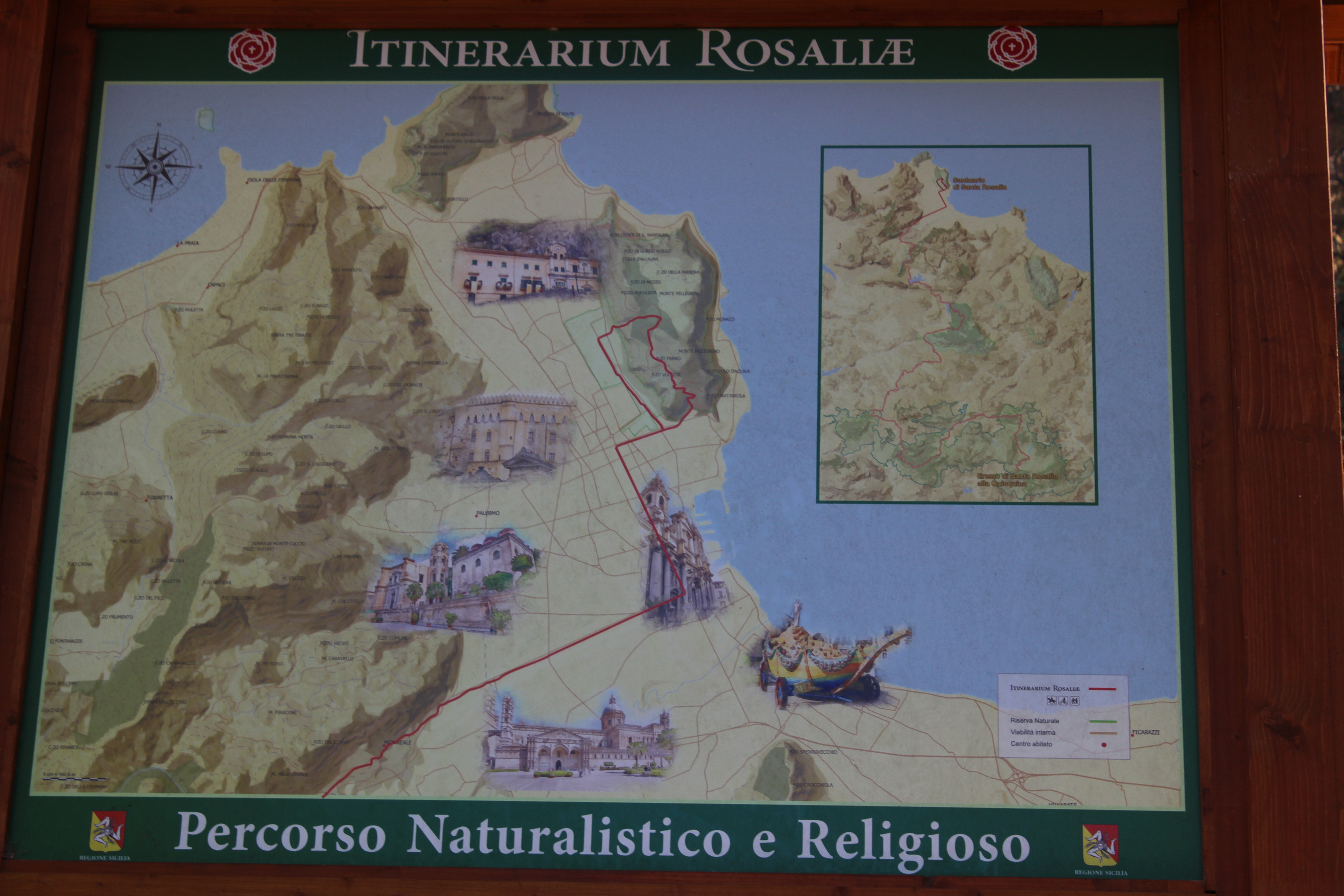 Después de admirar este fastuoso morumento visitamos el Santuario Santa Rosalia, es la patrona de la ciudad y este lugar es de culto hacia ella, Santa Rosalía fue una joven de la nobleza que se hizo ermitaña por amor a Dios. En su juventud joven vivió rodeada de vanidades terrenales pero luego entregó su corazón a Dios. Dejó su casa y y se fue a vivir en una cueva y en las paredes de la misma, escribió: “Yo, Rosalia, hija de Sinibald, Señor de Rosas y Quisquina, he tomado la decisión de vivir en esta cueva por el amor de mi Señor Jesucristo”. Allí permaneció oculta del mundo. Practicaba grandes mortificaciones y vivía en constante oración. Se fue a vivir después al monte Pellegrino, a unos tres kilómetros de Palermo. Murió sola, en el año 1160. Su cuerpo fue descubierto varios siglos más tarde, en 1625.